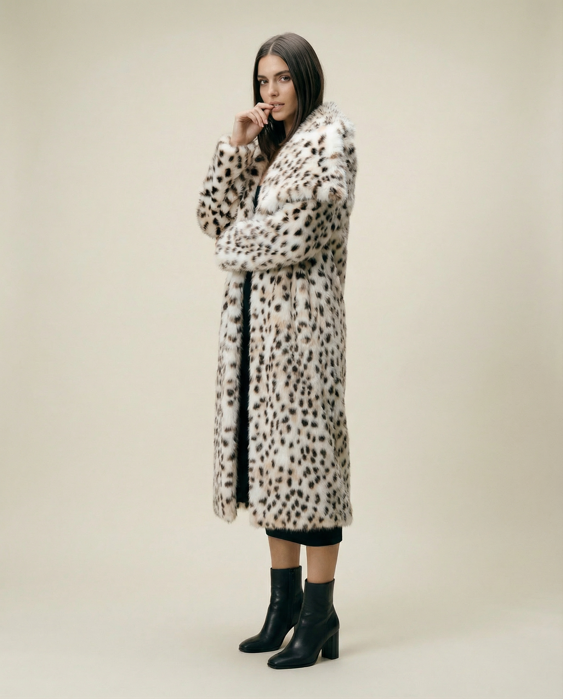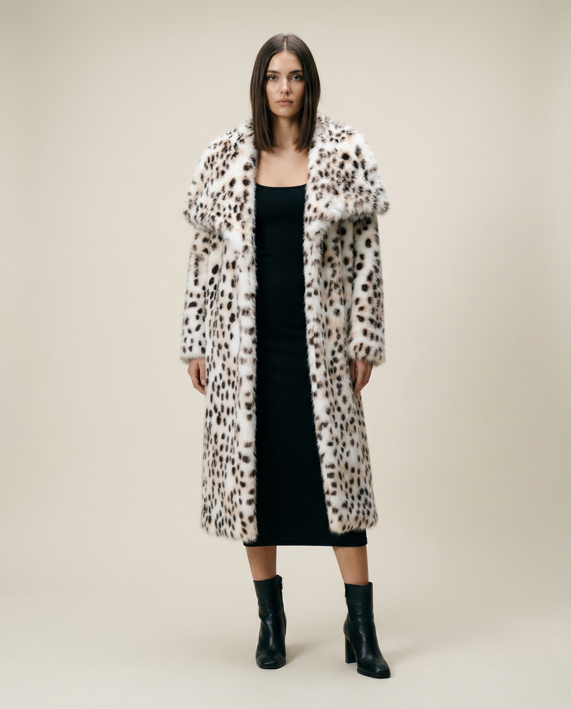 Aurora is a snow-leopard statement for women who’ve decided to take up space. The long, clean silhouette and soft, spotted faux-fur wrap you in quiet “main character” energy while actually keeping you warm on freezing city nights. It’s the coat you put on when you’re done dimming your light.