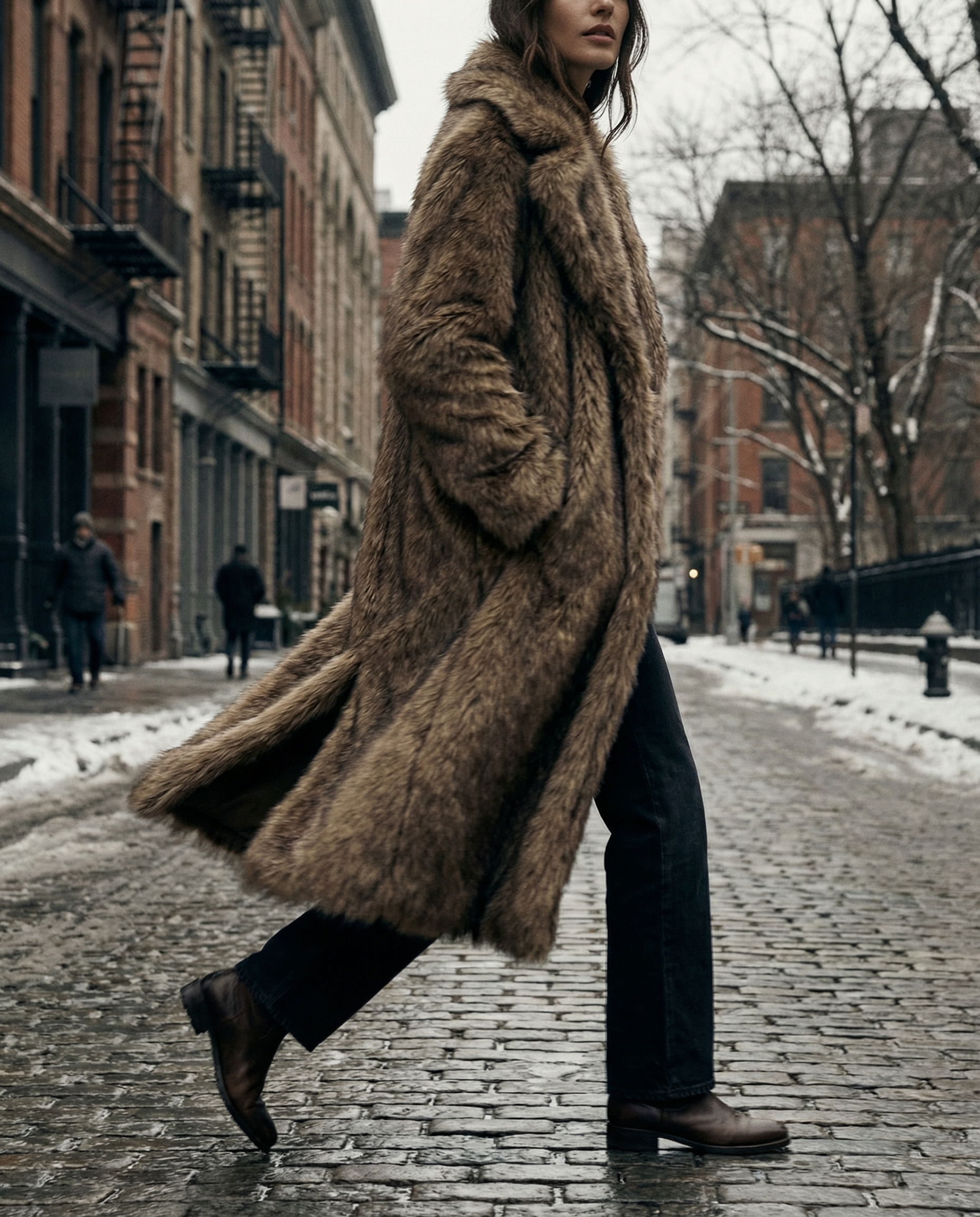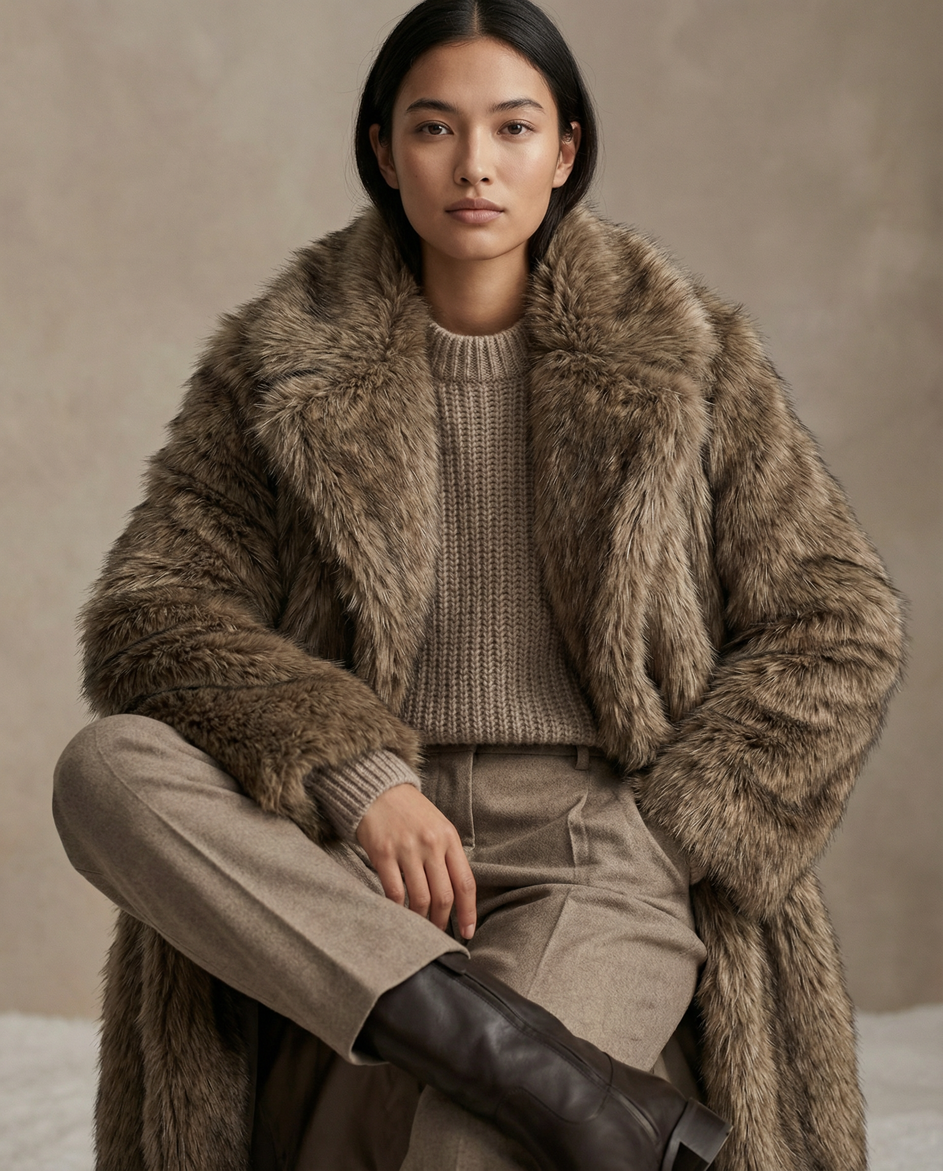 Arden is quiet luxury in faux fur form. The long, straight silhouette and soft, natural-brown pile feel like being wrapped in a vintage heirloom while still looking effortlessly modern over a slip dress or denim. It’s the coat you live in all winter when you want warmth, ease, and “I just threw this on” energy that still looks styled.
