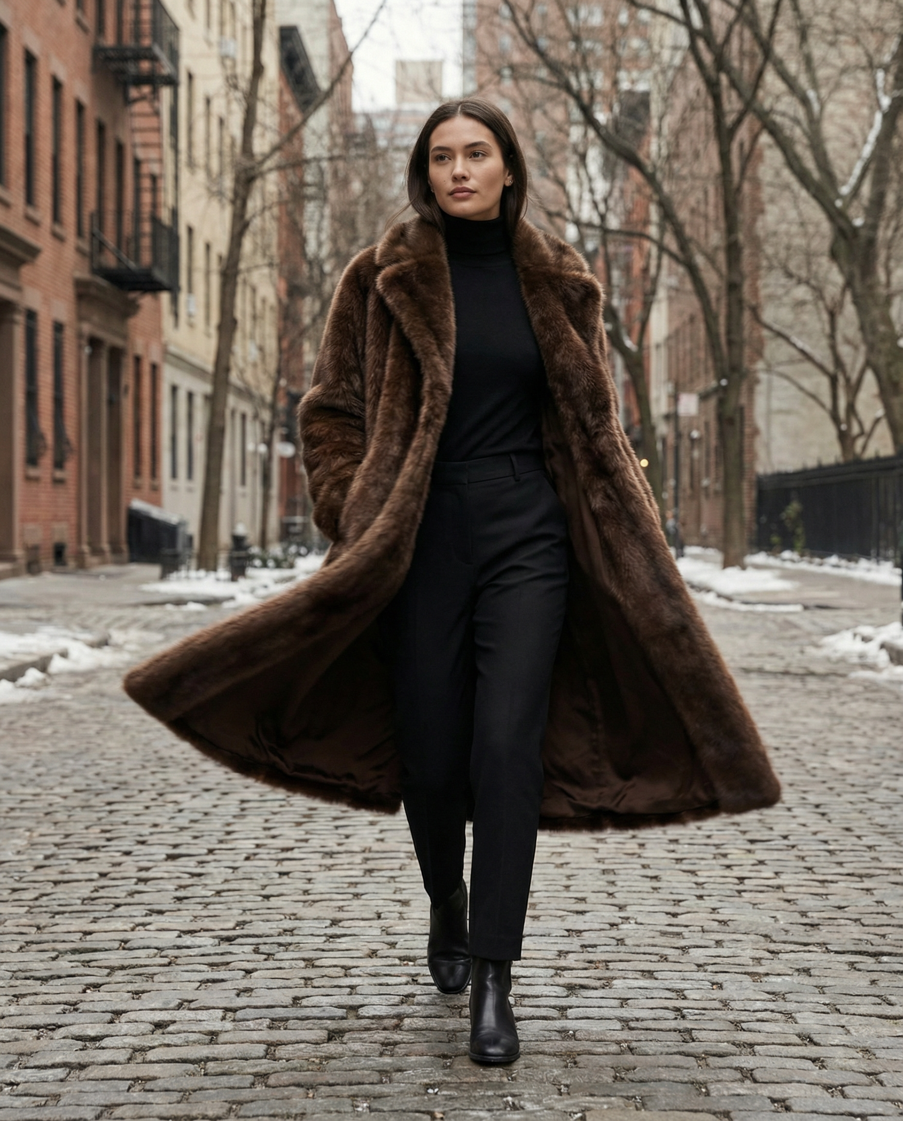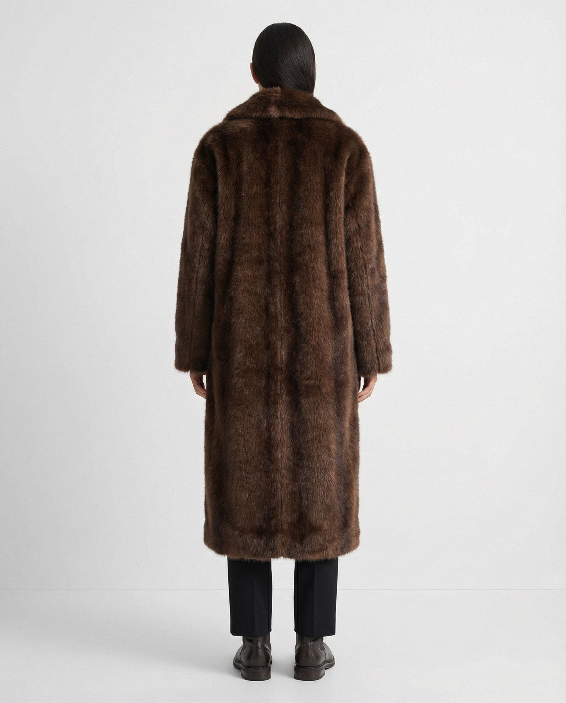 Alba is the coat you disappear into when winter feels loud. The deep chocolate faux-fur and long, straight silhouette cocoon you in warmth while keeping your outfit clean and minimal underneath. It’s the longline piece you reach for every day when you want comfort to look as polished as it feels.